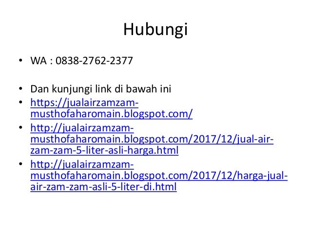 Harga Air Zam Zam Di Jakarta. Diriwayatkan oleh Abdullah ibnu Abbas, Aku pernah menyiapkan air zam zam untuk Rasulullah, kemudian beliau meminumnya sambil berdiri. Manfaat Air Zam-ZamBerdasar pada hadist Nabi, air zam zam merupakan air yang mengenyangkan dan memiliki khasiat untuk menyembuhkan penyakit.