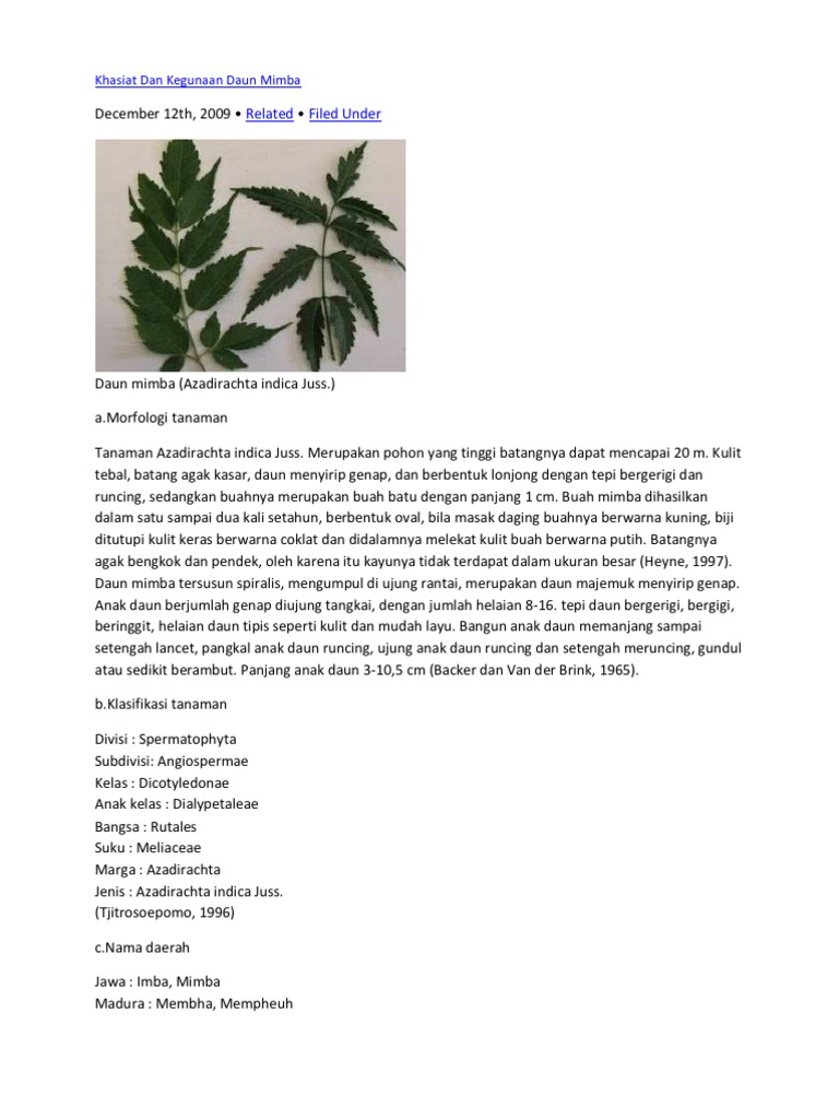 Kasiat Daun Mimba. Tanaman mimba pun sudah menyebar di beberapa kawasan Asia, termasuk Indonesia. Bahkan kayu dari pohon "Mimba" memiliki nilai jual tinggi di pasaran internasional, komoditas ini termasuk ekspor.